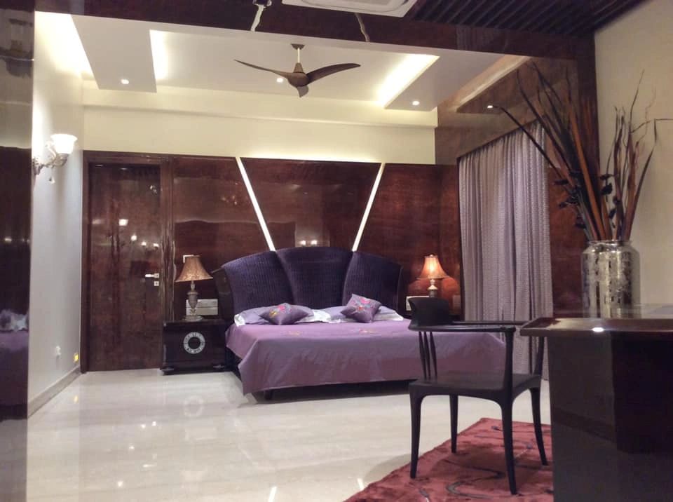 Opposite to the puja room is the dining area which has a chandelier and rich leather furniture adding an aristocratic touch to this indulgent space. The son’s bedroom on the ground floor is dominated by browns; the lighting is soft while the study takes care of the functional requirement. The highlight of this bedrooms is the lavish walk in wardrobe, Swarovski studded mirrors, floating panel with engraved artwork. The bathrooms are sophisticated and extravagant with Italian marble, shower cubicle and ornate bath fixtures.