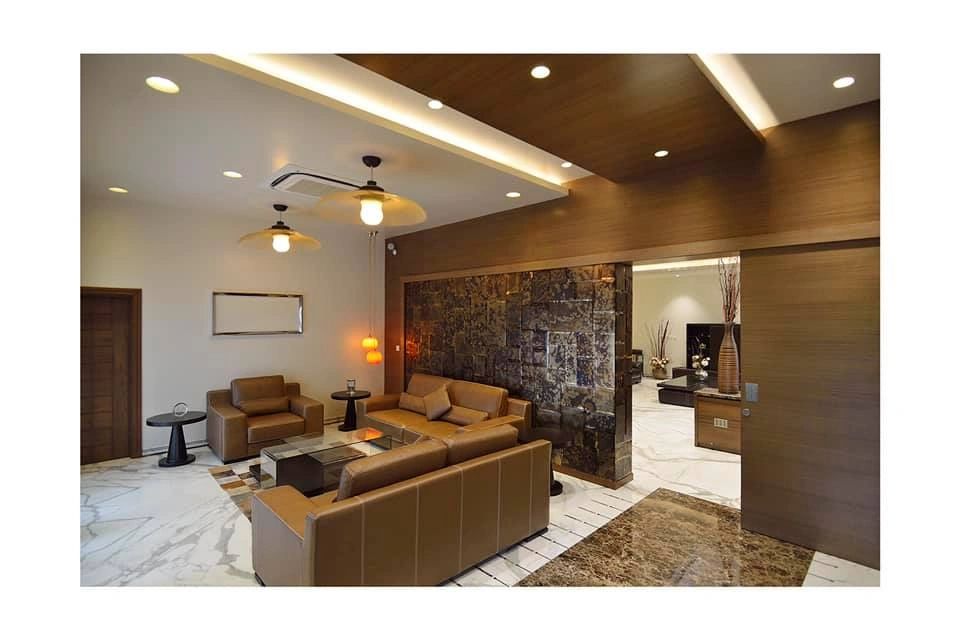The floor further opens up to a portico that is divided into a gym and a lawn. The gym has a false ceiling and cylindrical lighting fixtures which is rather unique in design and concept. Overlooking the gym is the lawn that also doubles up as a cocktail party area.