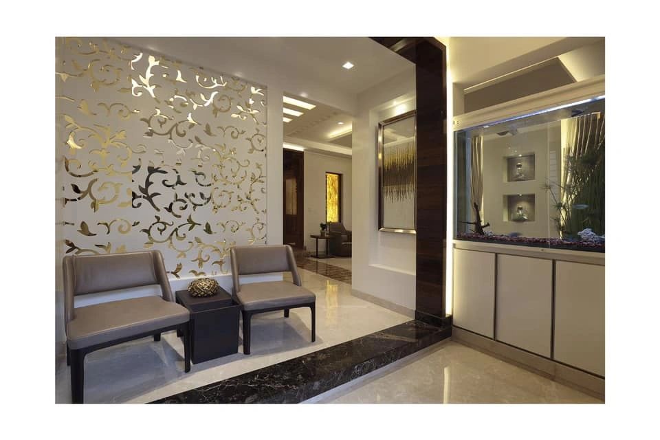 On the first floor, the intricate detailing of the railings with crystal clear glass and wood is admirable. Intricate mandala designs on the floor add a palatial feel. On this level, an exquisite lounge with beige recliners forms the casual seating area. The chandeliers and coffee table lends a dramatic touch to the décor.